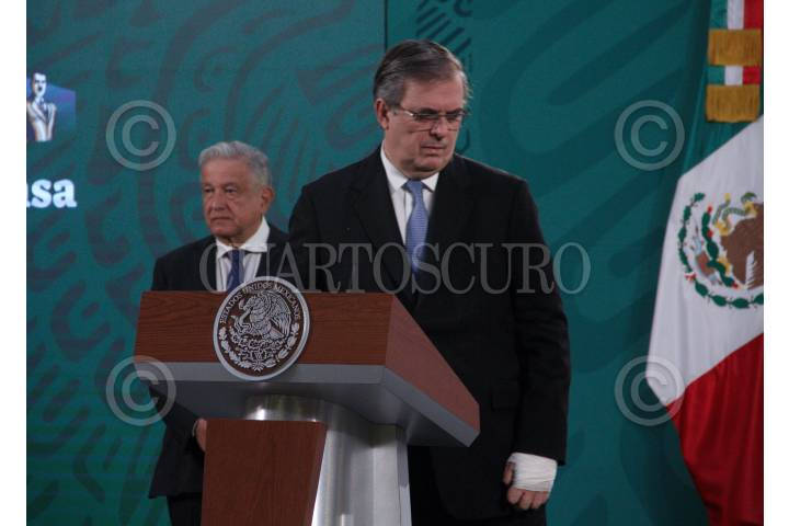 CIUDAD DE MÉXICO, 23MARZO2021.- Andrés Manuel López Obrador, presidente de México acompañado de Jorge Alcocer Varela, secretario de Salud; Marcelo Ebrard Casaubon, secretario de Relaciones Exteriores; Luis Cresencio Sandoval Gónzalez, secretario de la Defensa Nacional; Eduardo Redondo Arámbulo, subsecretario de Marina y Hugo López-Gatell Ramírez, subsecretario de Prevención y Promoción de la Salud, durante la conferencia dedicada al tema de Salud; destacando el avance de la vacunación contra COVID-19 en México. La conferencia se llevó a cabo en Palacio Nacional. FOTO: ANDREA MURCIA /CUARTOSCURO.COM