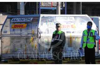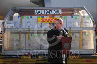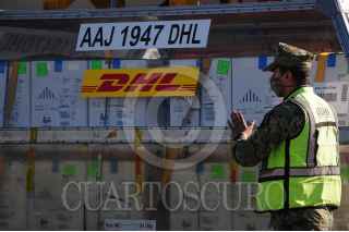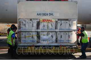 CIUDAD DE MÉXICO, 23MARZO2021.- Esta mañana arribaron al Aeropuerto Internacional de la Ciudad de México un embarque de más de 400 mil dosis de la vacuna antivocid elaborada por la farmacéutica Pfizer. Pedro Zenteno, director de Birmex, fue el encargado de recibir el cargamento del biológicos. Asimismo, se adelantó que este miércoles, Pfizer mandará otras 170 mil dosis y el jueves, Sinovac enviará a México un millón de esta medicina. FOTO: DANIEL AUGUSTO /CUARTOSCURO.COM