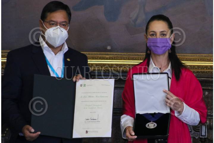 CIUDAD DE MÉXICO, 24MARZO2021.- Durante su visita a México, Luis Arce Catacora, presidente de Bolivia, fue recibido en el Palacio Virreinal por Claudia Sheinbaum, jefa de gobierno de la capital. En su reunión, el mandatario boliviano recibió el pergamino y la medalla como visitante distinguido de la Ciudad de México. FOTO: GOBIERNO DE LA CIUDAD DE MÉXICO /CUARTOSCURO.COM