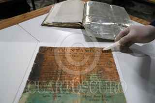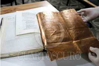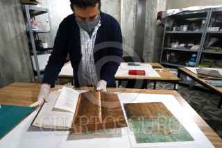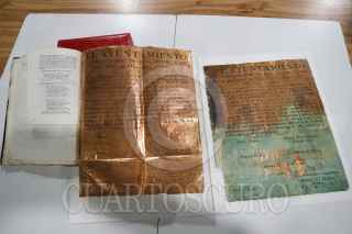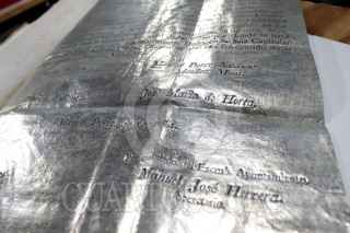 PUEBLA, PUEBLA, 25MARZO2021.- Hojas doradas y plateadas encontradas en el archivo municipal de Puebla serán analizadas para determinar si fueron elaboradas con oro amarillo o blanco. Los documentos son de 1822 y corresponden a jura de lealtad a Agustín de Iturbide. FOTO: MIREYA NOVO/CUARTOSCURO.COM