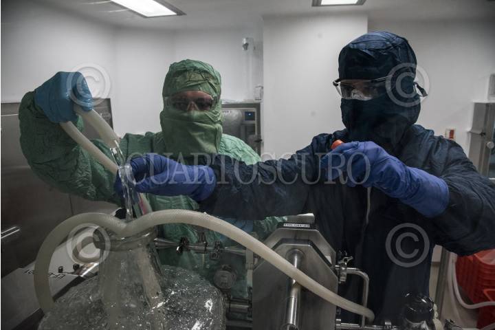 CIUDAD DE MÉXICO, 26MARZO2021.- El medicamento Factor de Transferencia o por su nombre de patente "Transferon" desarrollado por la Unidad de Desarrollo en Innovación Médica y Biotecnológica (UDIMEB) de la Escuela Nacional de Ciencias Biológicas (ENCB) del Instituto Politécnico Nacional (IPN) continúa siendo evaluado para su aprobación como auxiliar para el tratamiento para prevenir una infección grave por covid-19. En las instalaciones UDIMEB, el desarrollo del "Trasnferon" se lleva a cabo de forma constante siguiendo medidas extrictas sanitarias en diversas esclusas, donde el principio activo, el cual es un extracto dializable de leucocitos (células sanguíneas), se somete a diversos procesos para llegar al producto final que es el factor de transferencia el cual principalmente es destinado a personas con diversos padecimientos autoinmunes, infecciosos y crónico-degenerativos. Actualmente el "Trasnferon", continúa siendo incluído en protocolos sanitarios a nivel mundial para aprobar su posible alternativas terapéutica contra el SARS-CoV-2. FOTO: MARIO JASSO /CUARTOSCURO.COM