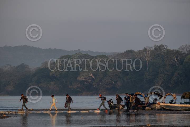 FRONTERA COROZAL, CHIAPAS, 27MARZO2021.- Cientos de migrantes en su mayoría hondureños cruzan la frontera entre México y Guatemala por el Río Usumacinta en lanchas. México impuso nuevas medidas para controlar la entrada de personas al país con actividades no escenciales, por tal motivo se han desplegado elementos del Instituto Nacional de Migración, Guardia Nacional y Ejercito, pero a la zona entre La Tenica y Fonrtera Corozal el transito continua sin cambios. FOTO: ISABEL MATEOS /CUARTOSCURO.COM