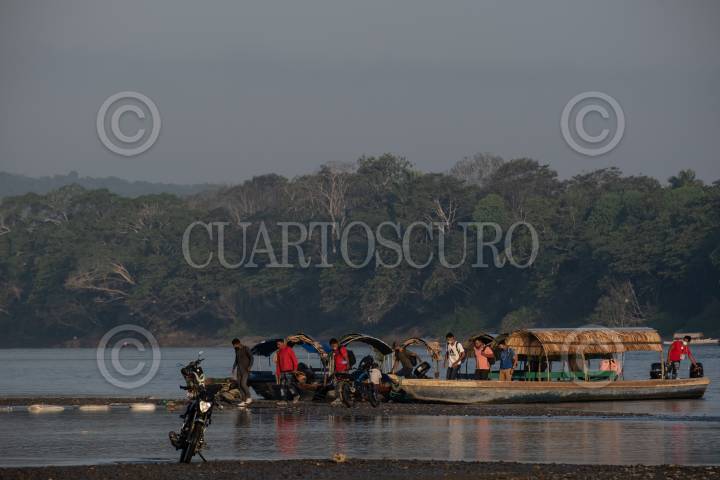 FRONTERA COROZAL, CHIAPAS, 27MARZO2021.- Cientos de migrantes en su mayoría hondureños cruzan la frontera entre México y Guatemala por el Río Usumacinta en lanchas. México impuso nuevas medidas para controlar la entrada de personas al país con actividades no escenciales, por tal motivo se han desplegado elementos del Instituto Nacional de Migración, Guardia Nacional y Ejercito, pero a la zona entre La Tenica y Fonrtera Corozal el transito continua sin cambios. FOTO: ISABEL MATEOS /CUARTOSCURO.COM