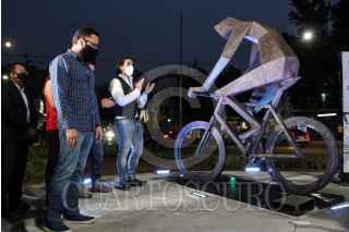 CIUDAD DE MÉXICO, 27MARZO2021.- Se llevó a acabó la inauguración de la ciclovía en el tramo de El Casco de Santo Tomás y de la escultura en honor a los ciclistas capitalinos, este acto fue encabezado por Víctor Hugo Romo, alcalde de Miguel Hidalgo y por David Camorilingas, escultor de la pieza. FOTO: ROGELIO MORALES /CUARTOSCURO.COM