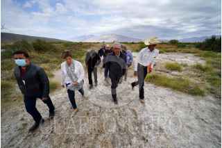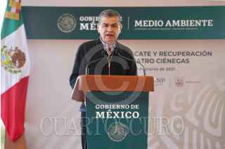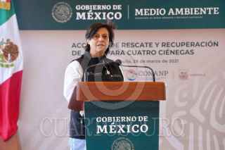 CUATRO CIÉNEGAS, COAHUILA, 28MARZO2021.- Andrés Manuel López Obrador, Presidente de México, encabezó la presentación de las "Acciones de rescate y recuperación de agua para Cuatro Ciénegas", Acompañaron al ejecutivo: Miguel Ángel Riquelme Solís, gobernador del estado de Coahuila; María Luisa Albores González, Secretaria de Medio Ambiente y Recursos Naturales, y Blanca Jiménez Cisneros, directora general de la Comisión Nacional del Agua (Conagua). FOTO: PRESIDENCIA/CUARTOSCURO.COM