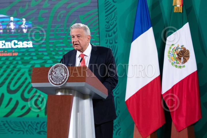 CIUDAD DE MÉXICO, 29MARZO2021.- Andrés Manuel López Obrador, Presidente de México, encabezó la conferencia matutina en Palacio Nacional. Lo acompañaron Olga Sánchez Cordero, titular de la Segob; Marcelo Ebrard, titular de la SRE; Elvira Pablo, representante de la Fuerza de Tarea de Jóvenes Generación Igualdad; Phumzile Mlambo-Ngcuka, directora ejecutiva de ONU Mujeres, y Surit Romero, encargada de Profeco. António Guterres, secretario general de la Organización de las Naciones Unidas (ONU), y Emmanuel Macron, presidente de Francia, ofrecieron mensajes virtuales, con motivo de la inauguración del Foro Generación Igualdad. FOTO: MOISÉS PABLO/CUARTOSCURO.COM