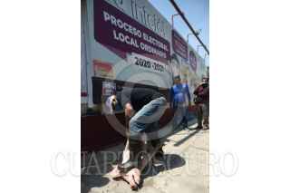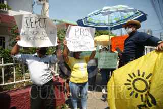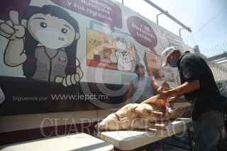 VILLAHERMOSA, TABASCO, 31MARZO2021.- Un grupo de perredistas de distintos municipios encabezados por su dirigente estatal, Javier Cabrera Sandoval, se plantaron y manifestaron a las afueras de la sede del Instituto Electoral y de Participación Ciudadana de Tabasco (IEPCT), para exigir que el gobernador Adán Augusto López Hernández saque las manos del proceso electoral. En el lugar mataron tres cerdos, para cocinarlos y darle de alimentar a los inconformes, quienes pidieron la destitución de los consejeros electorales encabezados por su presidenta Maday Merino. FOTO: CARLOS CANABAL OBRADOR/CUARTOSCURO.COM