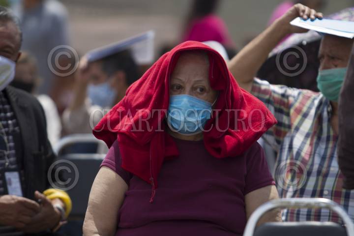 SAN NICOLÁS DE LOS GARZA, NUEVO LEÓN, 05ABRIL2021.- La primera dosis de la vacuna contra el Covid 19 comenzó en el municipio de San Nicolás de los Garza, perteneciente al área metropolitana de Monterrey, el cual cuenta con 84 mil adultos mayores, quienes saturaron uno de los módulos destinados causando que se agotaran las dos mil vacunas disponibles y tuvieran que esperar a la entrega de más de tres mil dosis ante altas temperaturas y bajo el sol. FOTO: GABRIELA PÉREZ MONTIEL / CUARTOSCURO.COM