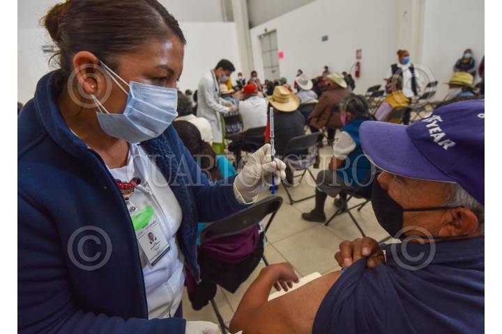 ALMOLOYA DE JUÁREZ, ESTADO DE MÉXICO, 06ABRIL2021.- Segundo día de vacunación en el auditorio “Luis Donaldo Colosio” en la cabecera municipal de Almoloya de Juárez, en donde se aplicó la vacuna de Astra Zeneca contra COVID-19, personal de salud mostró las jeringas que contenían la vacuna antes de ser aplicada; el lugar era sanitizado cada que salía un grupo de personas de la tercera edad al concluir su vacunación. En este municipio fueron recibidas 12500 dosis que fueron repartidas en tres sedes y recibieron a personas de otros municipios. FOTO: CRISANTA ESPINOSA AGUILAR /CUARTOSCURO.COM