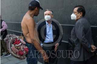 CIUDAD DE MÉXICO, 06ABRIL2021.- El ex ministro de la Suprema Corte de Justicia de la Nación, Eduardo Medina Mora, se detuvo a conversar con una un reportero en las afueras de la Suprema Corte de Justicia de la Nación, en ese momento se llevaban a cabo varias protestas como la de los habitantes de Nahuatzen, Michoacán, quienes exigen la libertad de sus presos políticos, En el momento en que charlaba se le acercó una persona en situación de calle para pedirle unas monedas, el ex ministro se buscó en los bolsillos pero le dijo que no traía efectivo, más tarde se retiró del lugar. FOTO: MOISÉS PABLO/CUARTOSCURO.COM