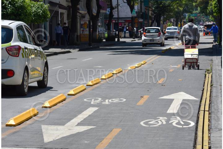 TOLUCA, ESTADO DE MÉXICO, 07ABRIL2021.- Los trabajos de acondicionamiento de la ciclovía de José Vicente Villada y Paseo Colón, siendo colocados delineadores para que automovilistas respeten los ciclocarriles, organizaciones de ciclistas hacen un llamado para que se vea el mismo avance en la ciclovía de Isidro Fabela en donde los comerciantes de la zona piden se reubique. FOTO: CRISANTA ESPINOSA AGUILAR /CUARTOSCURO.COM