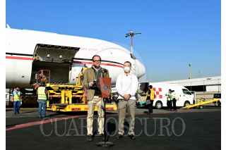 CIUDAD DE MÉXICO, 08ABRIL2021.- Arribaron vacunas contra COVID-19 en el Aeropuerto Internacional de la Ciudad de México (AICM). El evento lo encabezó Ruy López Ridaura, director General del Centro Nacional de Programas Preventivos y Control de Enfermedades y Pedro Zenteno, director de Birmex. FOTO: PRESIDENCIA /CUARTOSCURO.COM