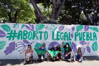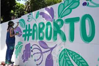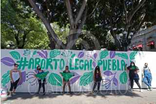 PUEBLA, PUEBLA, 08ABRIL2021.- Feministas pintaron un mural a favor de la legalización del aborto, en la estructura de madera que rodea al zócalo para su rehabiitación. El tema de la despenalización del aborto será abordado en el Congreso después del 15 de mayo. FOTO: MIREYA NOVO/CUARTOSCURO.COM