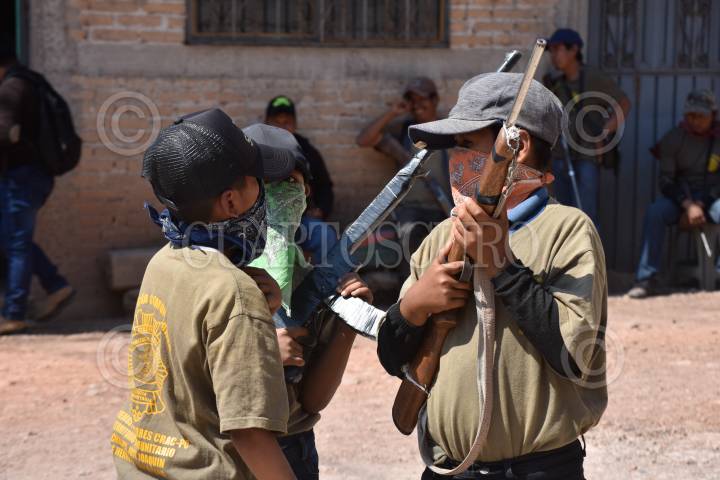JOSÉ JOAQUÍN DE HERRERA, GUERRERO, 10ABRIL2021.- Luego de 15 meses, la Coordinadora Regional de Autoridades Comunitarias - Policía Comunitaria, Pueblos Fundadores (CRAC-PC PF) presentaron a más niños como policías comunitarios, en la localidad de Ayahualtempa, por lo que ahora suman 34 menores de 15 años. En el mes de febrero del año pasado fueron presentados 17, que están siendo capacitados para defender a sus pueblos del acecho del crimen organizado. El coordinador de este grupo de comunitarios, Bernardino Sánchez Luna declaró que el gobierno del estado ha incumplido con los acuerdos de brindar seguridad, salud y educación a esta zona de la región de la montaña, por lo que han optado por recibir a más niños en sus filas, asegurando que los menores fueron quienes se ofrecieron para ser comunitarios. Este sábado, los menores marcharon por las calles de la localidad de Ayahualtempa e hicieron una demostración de las capacitaciones que han recibido, haciendo un llamado a las autoridades del ámbito federal y estatal para atender sus peticiones, mismas que ya habían sido pactadas hace 15 meses. Los ‘niños comunitarios’, como se les ha conocido a nivel internacional, van desde los siete hasta los 14 años de edad, reciben adiestramiento táctico tipo militar para disparar y saber posicionarse con las armas, pero solamente los que tienen más de 12 años usan armas de verdad, mientras que los más pequeños usan armas de madera o palos que simulan ser Ak-47 (cuernos de chivo) o AR-15. Sánchez Luna explicó que los menores también hacen recorridos como si fueran policías comunitarios adultos, además de que el grupo ya ha aumentado en número y en próximos días serán más de 40, debido al interés de otros infantes por formar parte de la CRAC para defender sus pueblos. “En Ayahualtempa no ha habido nada de apoyo…Hacemos un llamado al gobierno federal para que apoye a las 9 viudas de esta comunidad, a los 14 huérfanos y a los 34 desplazad