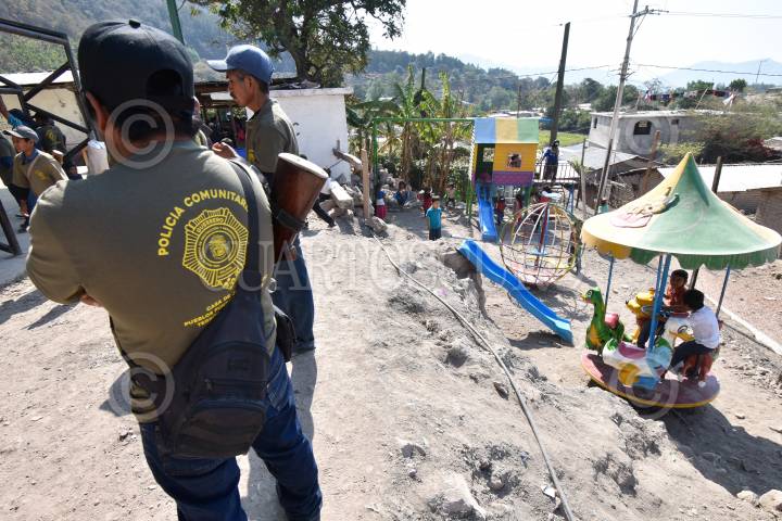 JOSÉ JOAQUÍN DE HERRERA, GUERRERO, 10ABRIL2021.- Luego de 15 meses, la Coordinadora Regional de Autoridades Comunitarias - Policía Comunitaria, Pueblos Fundadores (CRAC-PC PF) presentaron a más niños como policías comunitarios, en la localidad de Ayahualtempa, por lo que ahora suman 34 menores de 15 años. En el mes de febrero del año pasado fueron presentados 17, que están siendo capacitados para defender a sus pueblos del acecho del crimen organizado. El coordinador de este grupo de comunitarios, Bernardino Sánchez Luna declaró que el gobierno del estado ha incumplido con los acuerdos de brindar seguridad, salud y educación a esta zona de la región de la montaña, por lo que han optado por recibir a más niños en sus filas, asegurando que los menores fueron quienes se ofrecieron para ser comunitarios. Este sábado, los menores marcharon por las calles de la localidad de Ayahualtempa e hicieron una demostración de las capacitaciones que han recibido, haciendo un llamado a las autoridades del ámbito federal y estatal para atender sus peticiones, mismas que ya habían sido pactadas hace 15 meses. Los ‘niños comunitarios’, como se les ha conocido a nivel internacional, van desde los siete hasta los 14 años de edad, reciben adiestramiento táctico tipo militar para disparar y saber posicionarse con las armas, pero solamente los que tienen más de 12 años usan armas de verdad, mientras que los más pequeños usan armas de madera o palos que simulan ser Ak-47 (cuernos de chivo) o AR-15. Sánchez Luna explicó que los menores también hacen recorridos como si fueran policías comunitarios adultos, además de que el grupo ya ha aumentado en número y en próximos días serán más de 40, debido al interés de otros infantes por formar parte de la CRAC para defender sus pueblos. “En Ayahualtempa no ha habido nada de apoyo…Hacemos un llamado al gobierno federal para que apoye a las 9 viudas de esta comunidad, a los 14 huérfanos y a los 34 desplazad