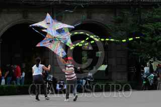 CIUDAD DE MÉXICO, 10ABRIL2021.- Unos niños jugaron con papalote en la explanada del Zócalo capitalino. FOTO: GRACIELA LÓPEZ /CUARTOSCURO.COM