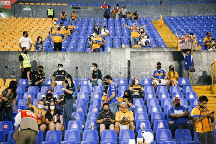 SAN NICOLÁS DE LOS GARZA, NUEVO LEÓN, 10ABRIL2021.- Ante la baja en contagios por Covid-19 y presentarse seis indicadores en verde, dos en amarillo y dos en naranja, la secretaría de salud del estado permitió la apertura de aficionados a los estadios de la ciudad con un aforo del 20%, tras más de un año de ausencia de público en los partidos. FOTO: GABRIELA PÉREZ MONTIEL / CUARTOSCURO.COM