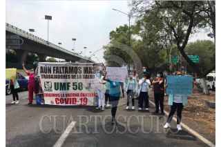 TLALNEPANTLA, ESTADO DE MÉXICO, 12ABRIL2021.- Trabajadores de la Unidad de Medicina Familiar (UMF) y del Hospital general de Zona (HGZ) número 58 del IMSS, bloquearon carriles centrales y laterales del Periférico Norte, con dirección a la Ciudad de México, a la altura de Santa Mónica, para exigir ser vacunados contra el Covid-19. Denunciaron que solo fueron vacunados médicos y enfermeras pero que todo el personal que también está en contacto con personas infectadas como; camilleros, laboratoristas y de intendencia. FOTO: ARMANDO MONROY/CUARTOSCURO.COM
