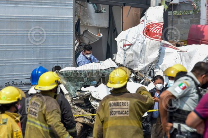 LERMA, ESTADO DE MÉXICO, 13ABRIL2021.- Un choque múltiple en la carretera México-Toluca a la altura del kilómetro 41 dejó tres personas muertas, se vieron involucrados tres trailers y tres autos particulares, el lugar fue resguardado por elementos de la Guardia Nacional; uno de los trailers terminó al interior de un negocio de comida con un auto particular. FOTO: CRISANTA ESPINOSA AGUILAR /CUARTOSCURO.COM