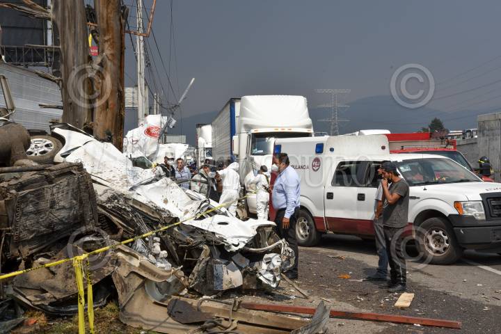 LERMA, ESTADO DE MÉXICO, 13ABRIL2021.- Un choque múltiple en la carretera México-Toluca a la altura del kilómetro 41 dejó tres personas muertas, se vieron involucrados tres trailers y tres autos particulares, el lugar fue resguardado por elementos de la Guardia Nacional; uno de los trailers terminó al interior de un negocio de comida con un auto particular. FOTO: CRISANTA ESPINOSA AGUILAR /CUARTOSCURO.COM