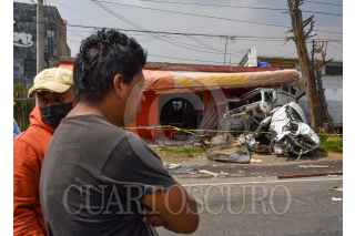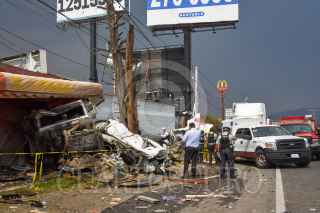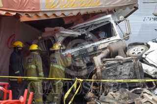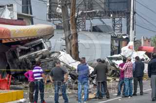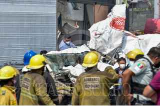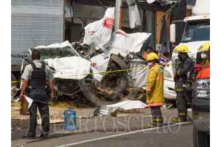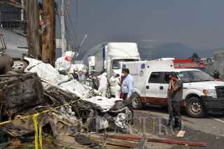 LERMA, ESTADO DE MÉXICO, 13ABRIL2021.- Un choque múltiple en la carretera México-Toluca a la altura del kilómetro 41 dejó tres personas muertas, se vieron involucrados tres trailers y tres autos particulares, el lugar fue resguardado por elementos de la Guardia Nacional; uno de los trailers terminó al interior de un negocio de comida con un auto particular. FOTO: CRISANTA ESPINOSA AGUILAR /CUARTOSCURO.COM