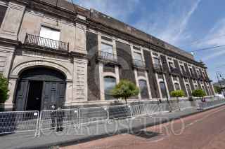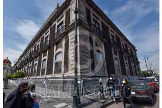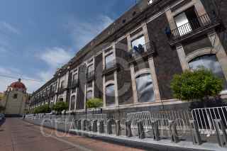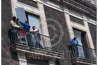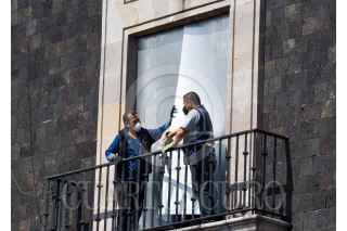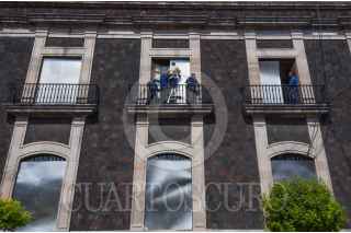 TOLUCA, ESTADO DE MÉXICO, 15ABRIL2021.- Trabajadores de la Cámara de Diputados local tapiaron todas las ventanas del recinto legislativo con láminas metálicas como medida de seguridad ante la impartición de un taller de bombas molotov dirigido a mujeres en el plantón por los derechos humanos de las mujeres que lleva ya un mes. FOTO: CRISANTA ESPINOSA AGUILAR /CUARTOSCURO.COM