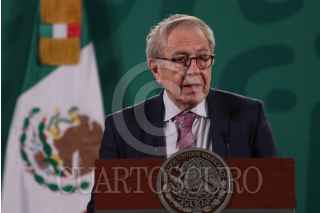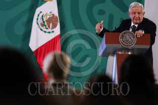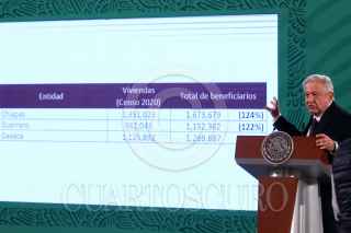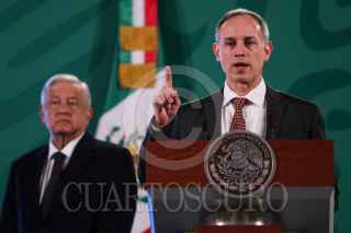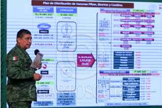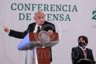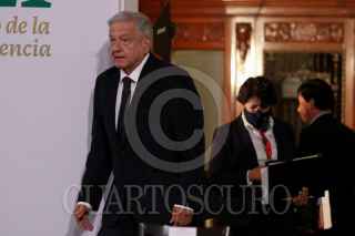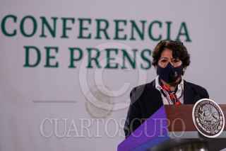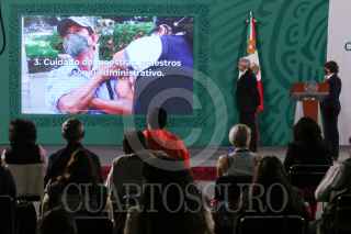 CIUDAD DE MÉXICO, 16ABRIL2021.- Andrés Manuel López Obrador, presidente de México, en compañía de Delfina Gómez, secretaria de Educación; Jorge Alcocer, secretario de Salud; Luis Cresencio Sandoval, secretario de la Defensa Nacional, y Hugo López-Gatell, subsecretario de Prevención y Promoción a la Salud. presentaron el Plan Nacional de Vacunación a Maestros con el fin de regresar a clases presenciales antes de que acabe el ciclo escolar corriente. Las autoridades informaron que los docentes serán inmunizados con la vacuna CanSino, la cual sólo requiere una dosis, y comenzaran el próximo martes 20 de abril en cinco entidades (Chiapas, Coahuila, Nayarit Veracruz y Tamaulipas). FOTO: GALO CAÑAS/CUARTOSCURO.COM