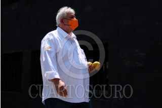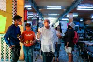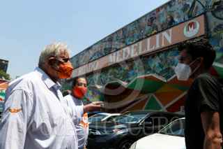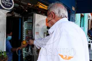 CIUDAD DE MÉXICO, 16ABRIL2021.- El candidato a la alcaldía Cuauhtémoc por Movimiento Ciudadano, Marco Rascón, realizó un recorrido por las calles de la alcaldía, desde su casa hasta el mercado Medellín, donde repartió naranjas y volantes a los locatarios con sus propuestas. FOTO: GALO CAÑAS/CUARTOSCURO.COM