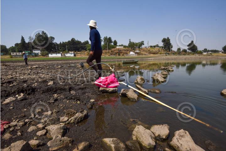 VILLA VICTORIA, ESTADO DE MÉXICO, 17ABRIL2021.- Vecinos de comunidades alrededor de la Presa de Villa Victoria batallan todos los días para poder llevar agua a sus hogares, ayudándose con varios metros de mangueras y bombas pueden tener un poco de agua para realizar sus actividades cotidianas, a pesar de vivir muy cerca del Sistema Cutzamala no cuentan con agua potable, deben de esperar a que la nata verde que se llega a formar en la orilla de la presa baje para poder llevar el agua. FOTO: CRISANTA ESPINOSA AGUILAR /CUARTOSCURO.COM