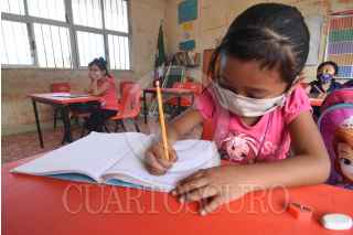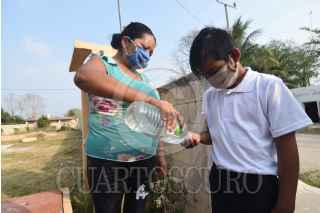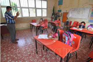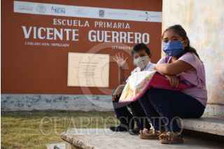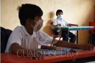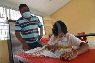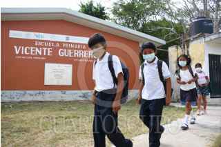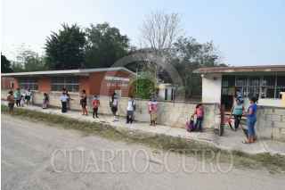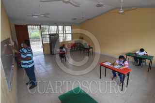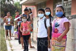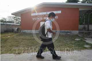 HOPELCHEN, CAMPECHE, 19ABRIL2021.- A más de un año de haber sido suspendidas las clases presenciales en México debido a la a contingencia sanitaria del Covid-19, hoy 137 Planteles Escolares contempladas en el Plan para la Reactivación Escalonada Mixta de los Servicios Educativos de Nivel Básico en Campeche regresaron a clases presenciales. En la comunidad de Cancabchen del municipio de Hopelchen, la escuela primaria Vicente Guerrero reabrió sus puertas a su primer grupo a las 8 de la mañana donde asistieron los primeros alumnos por grupo, al ingresar se siguió con el protocolo de salud con la toma de temperatura, uso del gel antibacterial y el uso del cubrebocas. El plantel cuenta con una plantilla total de 78 alumnos de primero a sexto grado quienes tomarán clases de manera escalonada, serán sólo 4 alumnos quienes se encuentren dentro de las aulas para mantener la distancia, serán dos horas de clases sin hora de receso, al término del uso del salón, serán sanitizados tanto el salón como el mobiliario para el acceso del siguiente grupo. FOTO: MICHAEL BALAM/CUARTOSCURO.COM