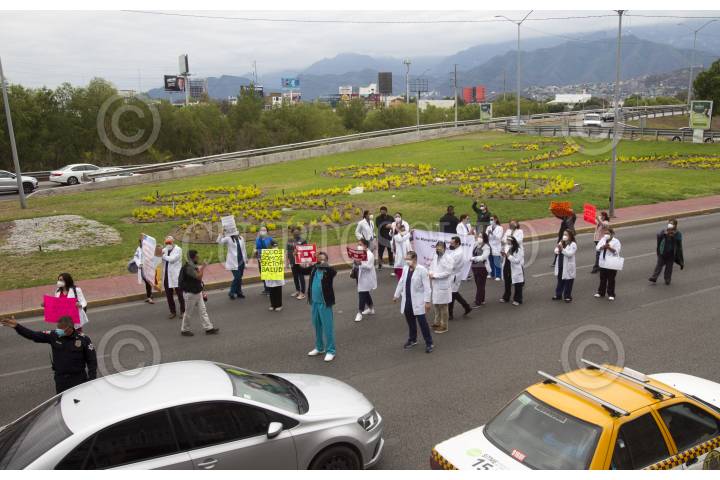 MONTERREY, NUEVO LEÓN, 19ABRIL2021.- Un grupo de médicos del sector público y privado bloquean la avenida Constitución, en el centro de la ciudad para exigir que todo el sector salud sea vacunado contra el Covid-19. FOTO: GABRIELA PÉREZ MONTIEL / CUARTOSCURO.COM