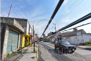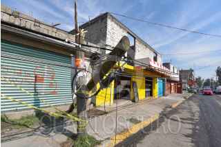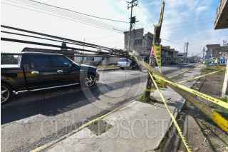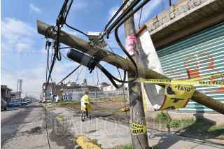 TOLUCA, ESTADO DE MÉXICO, 20ABRIL2021.- Un poste de teléfonos ubicación en la avenida Revolución en San Cristobal Huichochitlán se fracturó y ahora representa un peligro para peatones y automovilistas que transitan por la zona. FOTO: CRISANTA ESPINOSA AGUILAR /CUARTOSCURO.COM