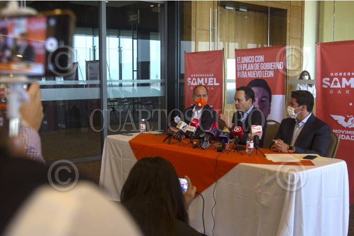 MONTERREY, NUEVO LEÓN, 21ABRIL2021.- Clemente Castañeda, dirigente nacional de Movimiento Ciudadano y Samuel García, candidato a la gubernatura de Nuevo León, ofrecieron una rueda de prensa donde acusan al presidente Andrés Manuel López Obrador de entrometerse en la contienda electoral de Nuevo León, así mismo señalan que el PRI apuesta por una guerra sucia en contra del candidato Samuel García y su partido. FOTO: GABRIELA PÉREZ MONTIEL / CUARTOSCURO.COM
