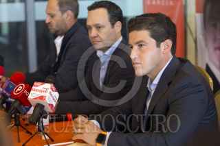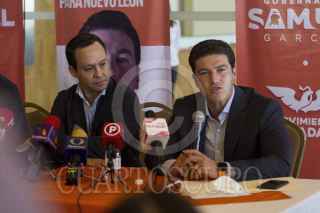 MONTERREY, NUEVO LEÓN, 21ABRIL2021.- Clemente Castañeda, dirigente nacional de Movimiento Ciudadano y Samuel García, candidato a la gubernatura de Nuevo León, ofrecieron una rueda de prensa donde acusan al presidente Andrés Manuel López Obrador de entrometerse en la contienda electoral de Nuevo León, así mismo señalan que el PRI apuesta por una guerra sucia en contra del candidato Samuel García y su partido. FOTO: GABRIELA PÉREZ MONTIEL / CUARTOSCURO.COM