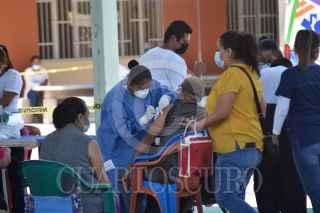 CHILPANCINGO, GUERRERO, 21ABRIL2021.- Con cinco horas de retraso, en los municipios de Quechultenango y Mochitlán, se dio inicio a la aplicación de la vacuna de única dosis contra el COVID-19, de la marca CANSINO, para los adultos mayores. Como lo anuncio el gobierno del estado, este miércoles inicio la vacunación de adultos mayores en al menos 17 municipios del estado, en algunos lugares se aplicaría la segunda dosis de la vacuna Sinovac, mientras que en otros la vacuna utilizada sería la de la marca CanSino que es de una sola dosis. En el caso de Quechultenango, los adultos mayores comenzaron a llegar a las sedes desde antes de las 8 de la mañana, señalando que, de último momento la sede les fue cambiada, pasando de la explanada municipal a una escuela primaria. En este lugar, también les cambiaron el horario, ya que los habían citado a las 8 de la mañana, pero los que madrugaron para ser de los primeros en recibir la dosis, fueron notificados que la cita se había cambiado para las 9 y media de la mañana; ya que no se sabía a qué hora llegarían las vacunas. Y fue hasta casi la una de la tarde cuando las vacunas llegaron; los adultos mayores reprocharon que las autoridades y el personal de la Secretaría del Bienestar, no contarán con una buena organización, ya que algunos de los beneficiarios se mantenían en ayunas por no perder su lugar. Una de las cosas que aplaudieron, fue que a pesar del reparto de fichas se les brindo facilidades a los adultos con discapacidades. En el caso de Mochitlán, las ambulancias de Protección Civil fueron habilitadas para transportar a las personas que requerían ser trasladados desde sus hogares, dado sus edades y/o enfermedades, para poder recibir esta vacuna. FOTO: DASSAEV TÉLLEZ ADAME/CUARTOSCURO.COM