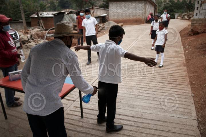 YAUTEPEC, OAXACA, 22ABRIL2021.- La comunidad de Santiago Quiavijolo regida por usos y costumbres, se unió al regreso a clases el pasado lunes en la escuela Bilingüe Gustavo Díaz Ordaz, luego de un año de pandemia . El retorno ha sido de manera ordenada y cumpliendo las medidas sanitarias. Con un total de 107 niños en los 6 grados de primaria y 7 docentes. El pasado 14 de marzo a través de asamblea general del poblado decidió regreso a clases pese que Oaxaca no ha regresado a semáforo Verde y se mantiene en naranja también sin autorización de la Secretaría de Educación Pública (SEP) esto porque en el lugar no se ha presentado ningún caso de contagio del virus SARS-COV-2. Los niños cuentan con tabletas y uniformes nuevos donados por distintas asociaciones. FOTO: ANDREA MURCIA /CUARTOSCURO.COM