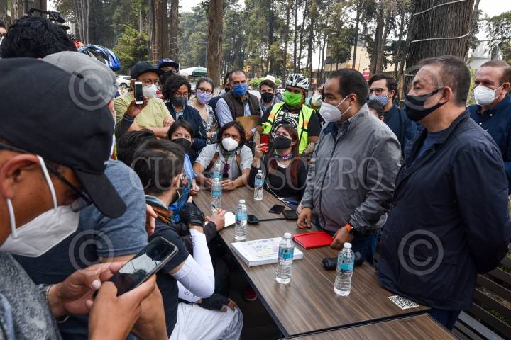 TOLUCA, ESTADO DE MÉXICO, 23ABRIL2021.- Después de la manifestación que realizaron Colectivos de ciclistas en día de ayer en Paseo Colón después del retiro sorpresivo de delineadores en la ciclovía de esta vialidad sostuvieron una reunión con el Secretario de Movilidad estatal Luis Gilberto Limón, acordando que se continuará con las mesas de diálogo, se dará mantenimiento constante a la ciclovías de la ciudad, y se tendrán operativos constantes para vigilar que los automovilistas respeten este espacio. FOTO: CRISANTA ESPINOSA AGUILAR /CUARTOSCURO.COM