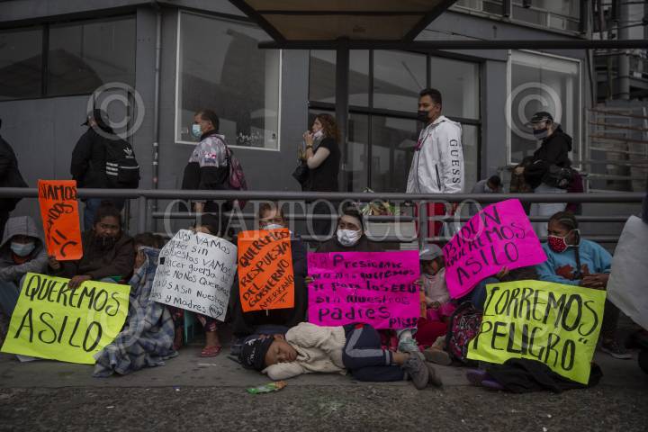 TIJUANA, BAJA CALIFORNIA, 23ABRIL2021.- Decenas de migrantes mexicanos y centroamericanos que se encuentran instalados en la garita de “El Chaparral” se manifestaron en la garita Internacional de San Ysidro con el objetivo de que sean escuchados y atendidos por las autoridades de Estados Unidos respecto al asilo político, esto debido a la situación crítica que viven en sus países de origen. Los migrantes han comentado que no se detendrán en sus manifestaciones hasta que se tomen cartas en el asunto por parte de Estados Unidos. Agentes del CBP (Oficina de Aduanas y Protección Fronteriza ) instalaron un fuerte operativo en la entrada del cruce fronterizo para para evitar que los migrantes ingresen al país. FOTO: OMAR MARTÍNEZ /CUARTOSCURO.COM