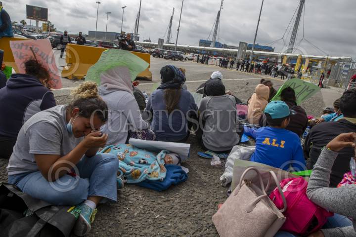 TIJUANA, BAJA CALIFORNIA, 23ABRIL2021.- Decenas de migrantes mexicanos y centroamericanos que se encuentran instalados en la garita de “El Chaparral” se manifestaron en la garita Internacional de San Ysidro con el objetivo de que sean escuchados y atendidos por las autoridades de Estados Unidos respecto al asilo político, esto debido a la situación crítica que viven en sus países de origen. Los migrantes han comentado que no se detendrán en sus manifestaciones hasta que se tomen cartas en el asunto por parte de Estados Unidos. Agentes del CBP (Oficina de Aduanas y Protección Fronteriza ) instalaron un fuerte operativo en la entrada del cruce fronterizo para para evitar que los migrantes ingresen al país. FOTO: OMAR MARTÍNEZ /CUARTOSCURO.COM