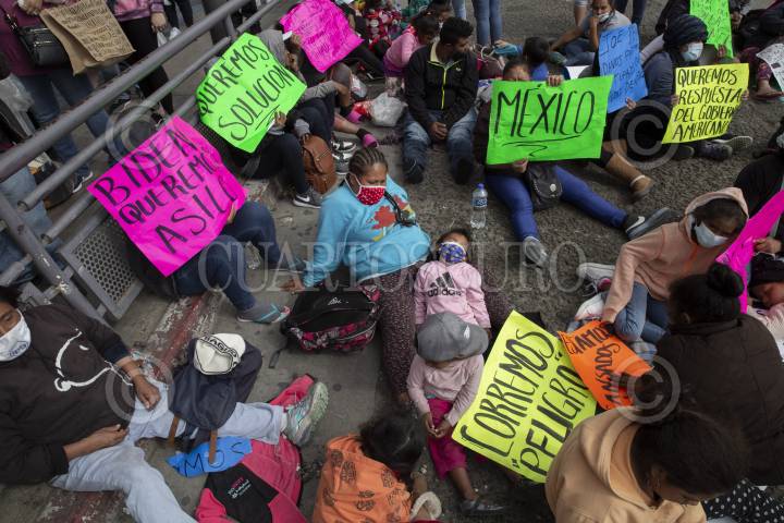 TIJUANA, BAJA CALIFORNIA, 23ABRIL2021.- Decenas de migrantes mexicanos y centroamericanos que se encuentran instalados en la garita de “El Chaparral” se manifestaron en la garita Internacional de San Ysidro con el objetivo de que sean escuchados y atendidos por las autoridades de Estados Unidos respecto al asilo político, esto debido a la situación crítica que viven en sus países de origen. Los migrantes han comentado que no se detendrán en sus manifestaciones hasta que se tomen cartas en el asunto por parte de Estados Unidos. Agentes del CBP (Oficina de Aduanas y Protección Fronteriza ) instalaron un fuerte operativo en la entrada del cruce fronterizo para para evitar que los migrantes ingresen al país. FOTO: OMAR MARTÍNEZ /CUARTOSCURO.COM