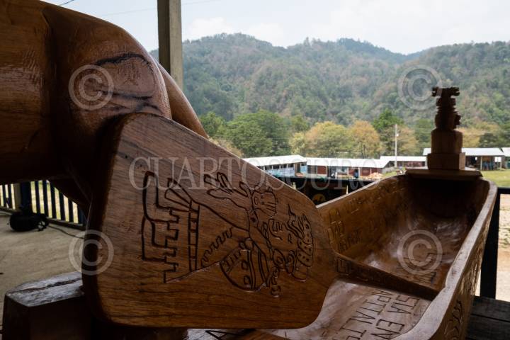 ALTAMIRANO, CHIAPAS, 25ABRIL2021.- Continuan las despedidas del Escuadron 421; delegación maritima del Ejercito Zapatista de Liberación Nacional, conformada por siete zapatistas quienes iniciarán su travesía, primero por tierra hasta el puerto donde un barco zarpará con rumbo a Europa teniendo como objetivo compartir la palabra y experiencias con organizaciones y población civil en diferentes paises de dicho continente y encontrarse con otras luchas. En el Caracol "Semillero de la comandanta Ramona", fabricaron una replica de un barco de más de 100 metros con la leyenda "Despertad" y una bandera zapatista en el mastil, el cual es resguardado por milicianos, tambien se presentaron embarcaciones de madera a tamaño escala, talladas y pintadas a mano por los zapatistas de los diversos caracoles con leyendas alusivas al viaje como "Ya no soy santa pero sí María". FOTO: ISABEL MATEOS /CUARTOSCURO.COM