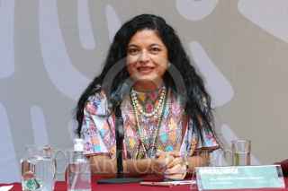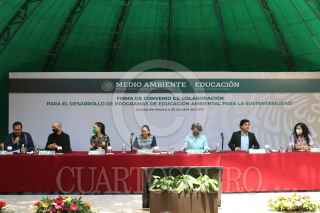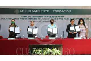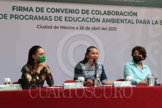 CIUDAD DE MÉXICO, 26ABRIL2021.- Claudia Sheinbaum Pardo, Jefa de Gobierno; María Luisa Albores González, titular de la Semarnat; Delfina Gómez Álvarez, titular de la SEP; Jesús Ramírez Cuevas, Vocero de la Presidencia; y Alejandra Frausto, secretaria de Cultura, encabezaron la firma de convenio de colaboración "Desarrollo de programas de educación ambiental para la sustentabilidad". FOTO: MOISÉS PABLO/CUARTOSCURO.COM
