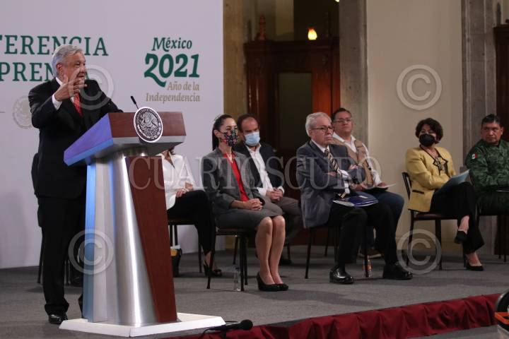CIUDAD DE MÉXICO, 27ABRIL2021.- Andrés Manuel López Obrador, presidente de México, junto con: Jorge Alcocer, secretario de Salud; Hugo López-Gatell, subsecretario de Prevención y Promoción a la Salud; Claudia Sheinbaum, jefa de gobierno de la Ciudad de México; Delfina Gómez, secretaria de Educación; Luis Cresencio Sandoval, secretario de la Defensa Nacional; Martha Delgado, subsecretaria para Asuntos Multilaterales y Derechos Humanos de la Secretaria de Relaciones Exteriores, y Ruy López Ridaura, director general del Centro Nacional de Programas Preventivos y Control de Enfermedades, encabezaron el informe semanal de “El Pulso de la Salud” donde se anunció que la capital del país acumula 14 semanas a la baja respecto a los contagios y hospitalizaciones por covid-19. Asimismo, se dio a conocer que a partir del día de mañana iniciará el per-registro para la población de 50-59 años que será vacunada, a fin de comenzar en mayo con la inmunización. FOTO: GALO CAÑAS/CUARTOSCURO.COM