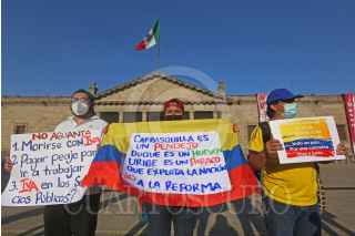 GUADALAJARA, JALISCO, 28ABRIL2021.- Colombianos residentes en la ciudad protestaron para apoyar a sus compatriotas en un paro nacional realizado este 28 de Abril en las principales ciudades de Colombia, esto a causa de una reforma tributaria a manos del gobierno sub dirigido por Iván Duque Márquez, que incluye el IVA a la mayoría de los productos de la canasta básica. FOTO: FERNANDO CARRANZA GARCIA / CUARTOSCURO.COM