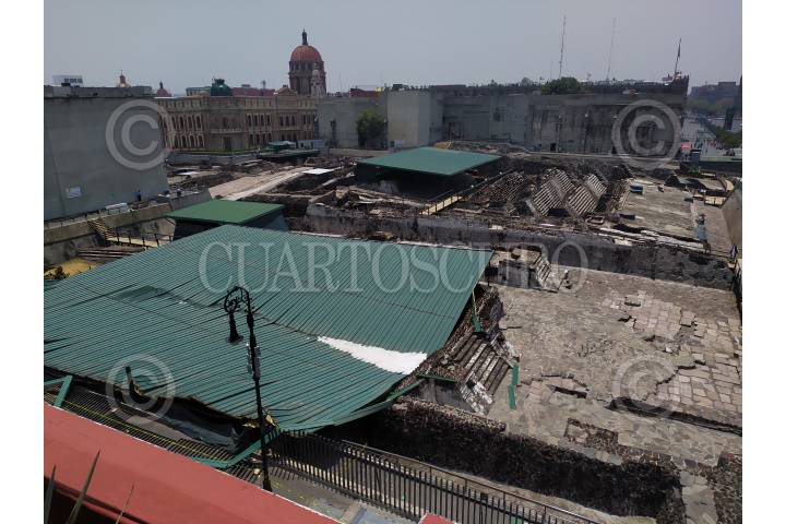 CIUDAD DE MÉXICO, 29ABRIL2021.- Continúan los trabajos de peritaje y salvaguarda del Templo de las Águilas del Templo Mayor cuyo techo se desplomó la noche de ayer tras la intensa lluvia. FOTO: GALO CAÑAS/CUARTOSCURO.COM