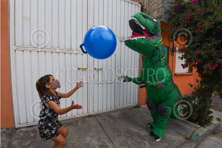 TOLUCA, ESTADO DE MÉXICO, 30ABRIL2021.- Para la celebración del Día del Niño muchos saldrán a celebrar otros permanecerán en casa, la entidad mexiquense se encuentra en semáforo epidemiológico color amarillo, se continúa exhortando a mantener las medidas higiénicas y no frecuentar lugares concurridos, ante esto la empresa con causa El Detallote Tl de Tlatoani ofreció desayunos personalizados entregados a la puerta de su casa de cada niño por un T-rex, el cual es del agrado para muchos niños, las ganancias de los desayunos vendidos será para continuar apoyando la adquisición de prótesis externas y mangas para linfedema, entre otros programas de ayuda de la fundación Chichis pa la Banda. FOTO: CRISANTA ESPINOSA AGUILAR / CUARTOSCURO.COM
