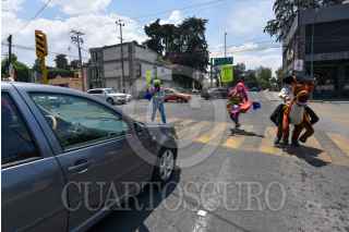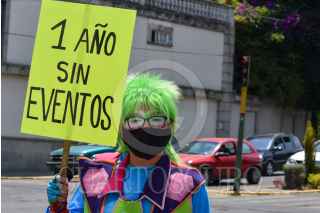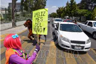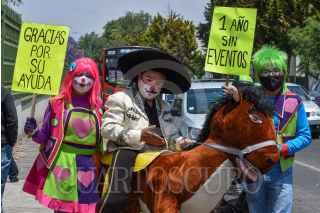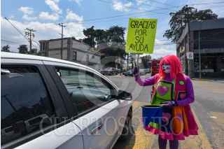 TOLUCA, ESTADO DE MÉXICO, 30ABRIL2021.- Armando Hernández Payaso Tino Platino, junto con sus hijos Vanesa y José Armando Hernández, payasitos Burbujita y Robin, a partir del año pasado no han tenido trabajo en shows debido a la contingencia por COVID-19, a un año han tenido que vender la mayoría de sus muebles para poder tener dinero, han tenido que racionar la comida entre los integrantes de la familia lo que los ha llevado a bajar considerablemente de peso, y la enfermedad de uno de sus hijos pequeños hizo que buscaran otras formas de obtener dinero para poder solventar los gastos médicos; actualmente llevan dos meses dando un pequeño espectáculo en los semáforos de la ciudad de Toluca para llevar un poco de alegría a niños y adultos que circulan por diversas avenidas, para no poner en riesgo su salud utilizan su cubrebocas, cargan sanitizantes y con unas bolsas que ellos mismos hicieron recogen el dinero que la gente les da, piden a la población se solidarice con ellos y su situación. FOTO: CRISANTA ESPINOSA AGUILAR /CUARTOSCURO.COM