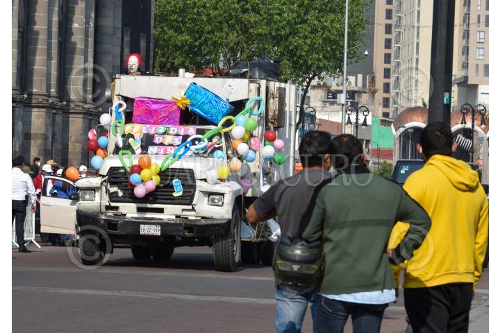 TOLUCA, ESTADO DE MÉXICO, 30ABRIL2021.- Recolectores de basura de Toluca con recursos propios organizaron una caravana en los camiones de basura por la zona centro de la capital mexiquense, adornados con globos y dulces y con botargas le desearon un feliz día a los niños durante su festejo. FOTO: CRISANTA ESPINOSA AGUILAR /CUARTOSCURO.COM