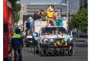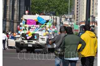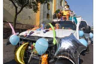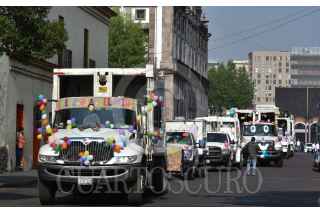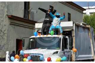 TOLUCA, ESTADO DE MÉXICO, 30ABRIL2021.- Recolectores de basura de Toluca con recursos propios organizaron una caravana en los camiones de basura por la zona centro de la capital mexiquense, adornados con globos y dulces y con botargas le desearon un feliz día a los niños durante su festejo. FOTO: CRISANTA ESPINOSA AGUILAR /CUARTOSCURO.COM