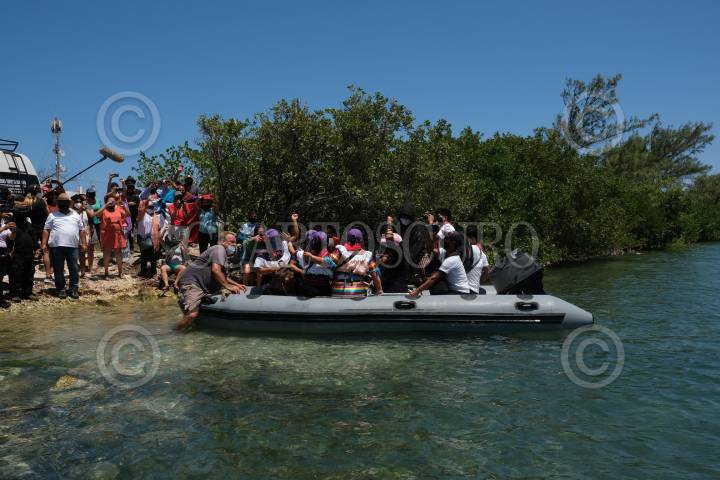 ISLA MUJERES, QUINTANA ROO, 30ABRIL2021.- La delegación marítima del Ejército Zapatista de Liberación Nacional arribó al puerto a medio día. Ya con su equipaje tomaron una lancha que los llevó al barco La Montaña donde viajaran hasta el continente Europeo con el objetivo de compartir su lucha y de esta forma encontrarse con otras. Durante más de seis semanas los siete zapatistas cruzarán el océano para anclar en un puerto español continuando sus denuncias, aprendizajes y formas organizativas con otros. FOTO: ISABEL MATEOS/CUARTOSCURO.COM
